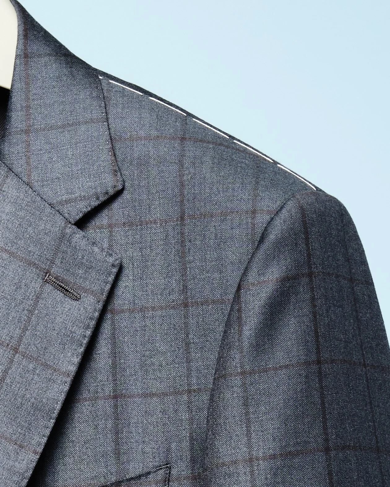 Exclusive S160s regular fit mid grey with brown window pane check $5995 Closeup for pattern and detail
