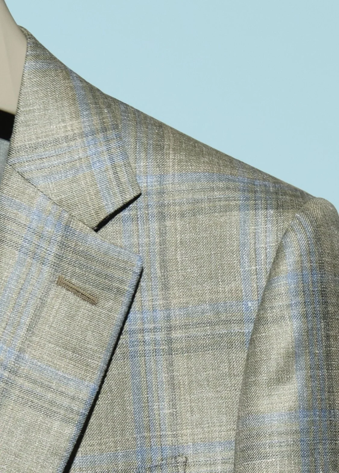 Regular Fit 49% wool 30% Silk 21% Linen in apple green with pale blue overcheck $3300 Closeup for pattern