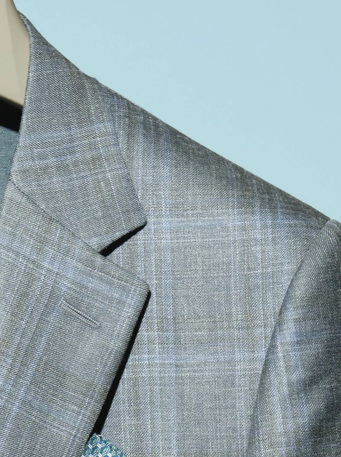 Regular Fit 49% wool 30% Silk 21% Linen in sage green with pale blue overcheck $3300 Closeup for texture and pattern