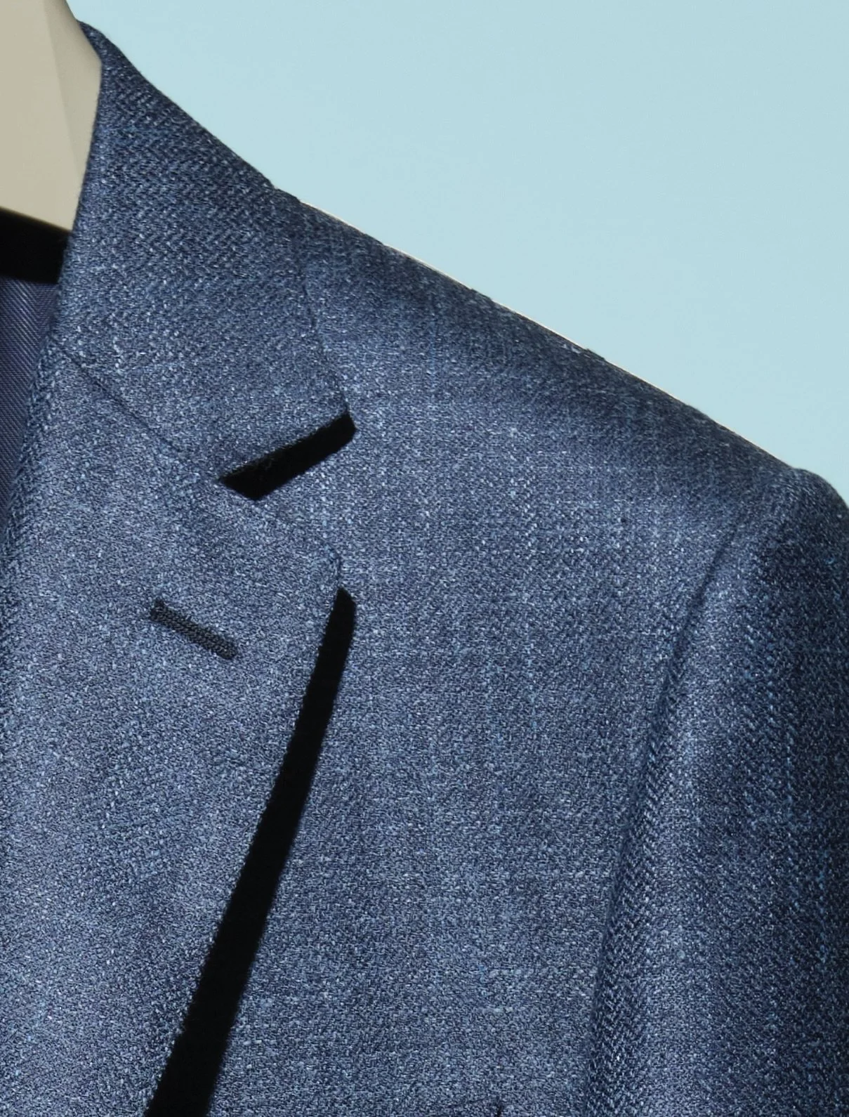 Closeup for texture and detail Regular Fit 1/2 lined 46% cashmere 28% linen 26% silk in marine blue herringbone $4995